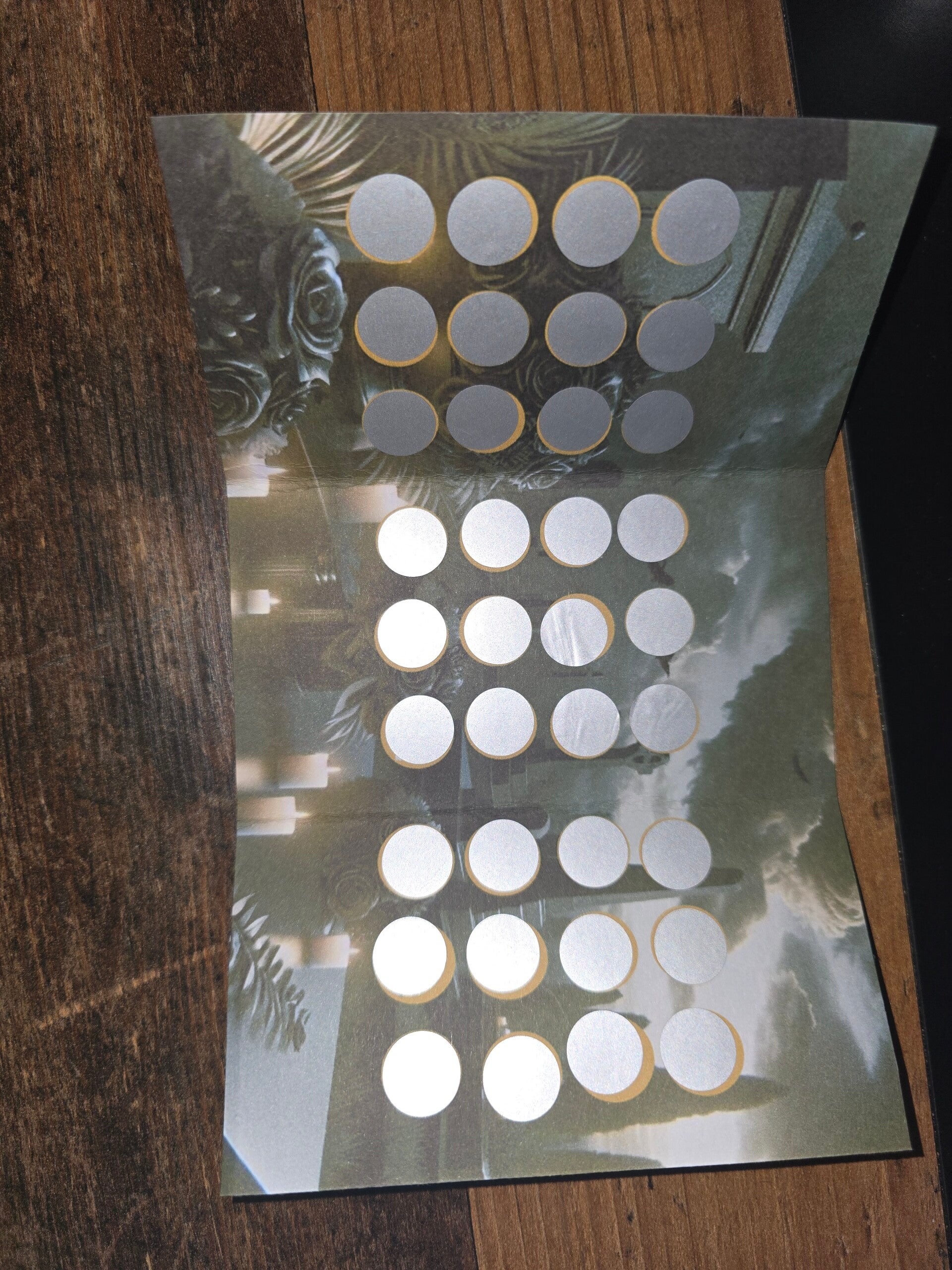 Diese Klappkarte verbirgt unter Rubbelfeldern verschiedene Aktionssymbole. Sobald du eine Aktion erfolgreich aufgeruubelt hast, siehst du welchesFeld / Aktion du besparen musst.
